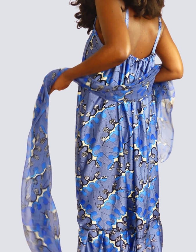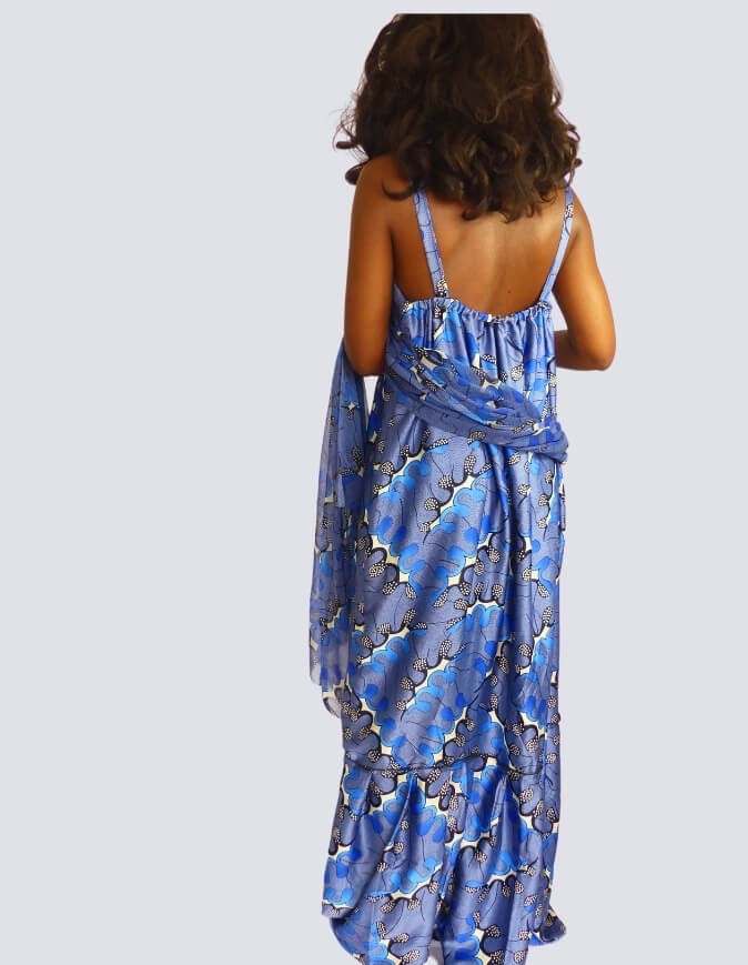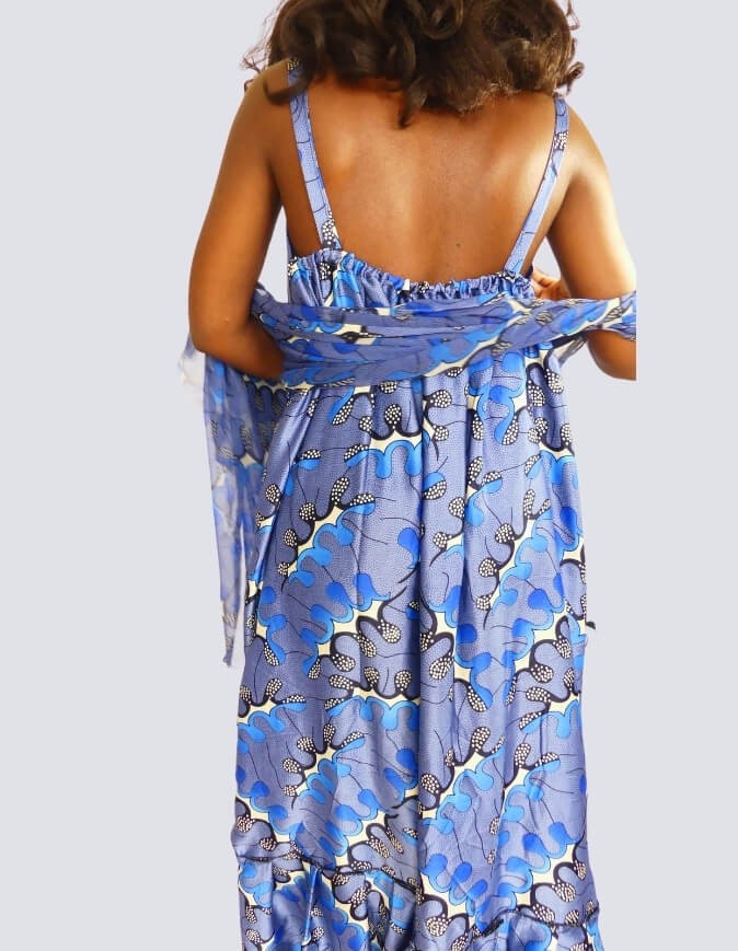 Très Jolie robe évasée imprimée en satin de soie longue. Manches fines bretelles, évasée, ce qui permet une meilleure aisance et la possibilité d’enfiler la robe quelque soit la taille. La robe est évasée, légère et Idéale pour l’été, se porte en toute occasion. Echarpe/foulard 2yards en mousseline de soie vendu avec.