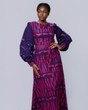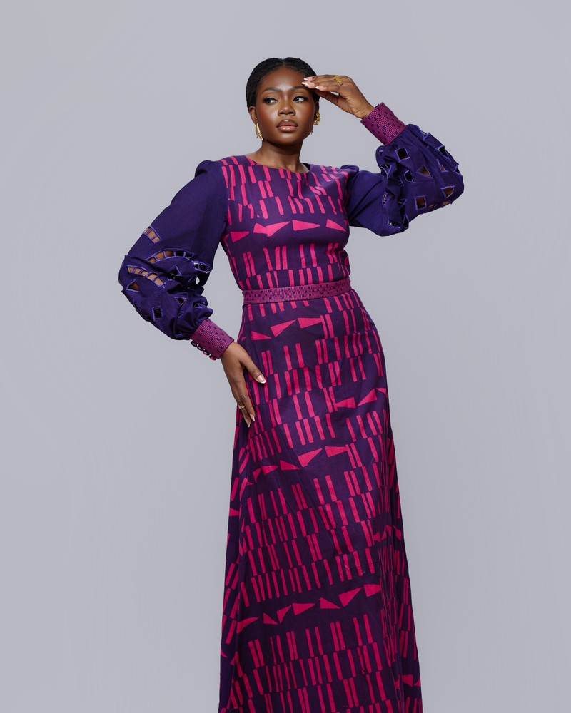 Entièrement en coton fait main avec ses manches brodées délicatement et ses détails en pagne tissé, la robe longue batik Fâ est parfaite pour vos événements chics.
