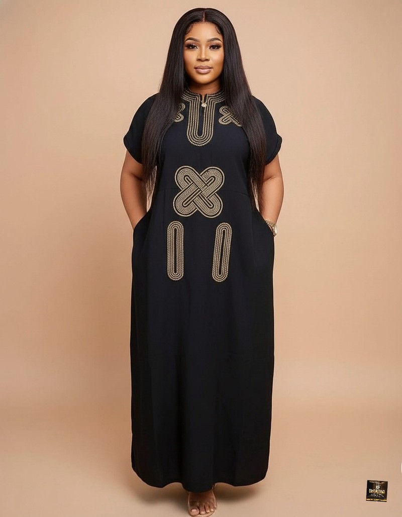 This glamorous tunic dress offers a modern take on traditional styles, crafted from a luxurious, soft black crepe fabric that drapes beautifully and catches the light. The sophisticated design is elevated by intricate, high-contrast silver stones adorning the neckline and front. The central motif is a stylized knot design, flanked by two vertical parallel patterns, creating a symmetrical and striking visual focal point. Featuring a comfortable, short-sleeve silhouette and a lonh-dress length, this piece is an elegant choice for special events, parties, or formal evening occasions where a touch of opulent texture and sparkling detail is desired.
