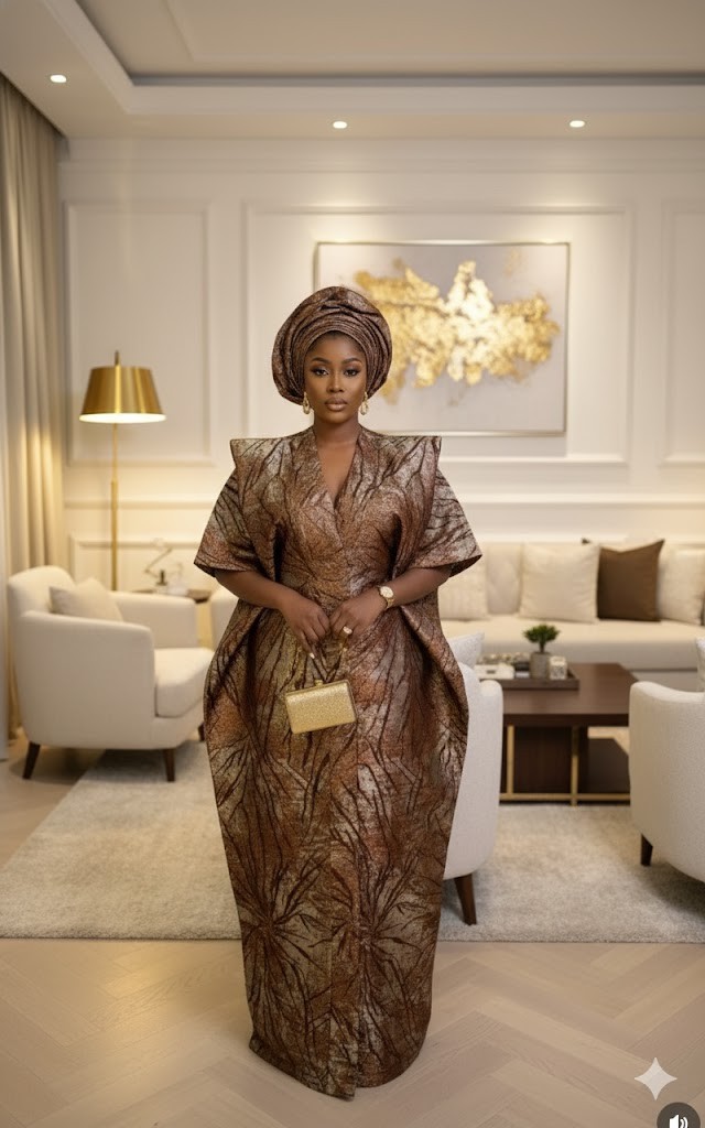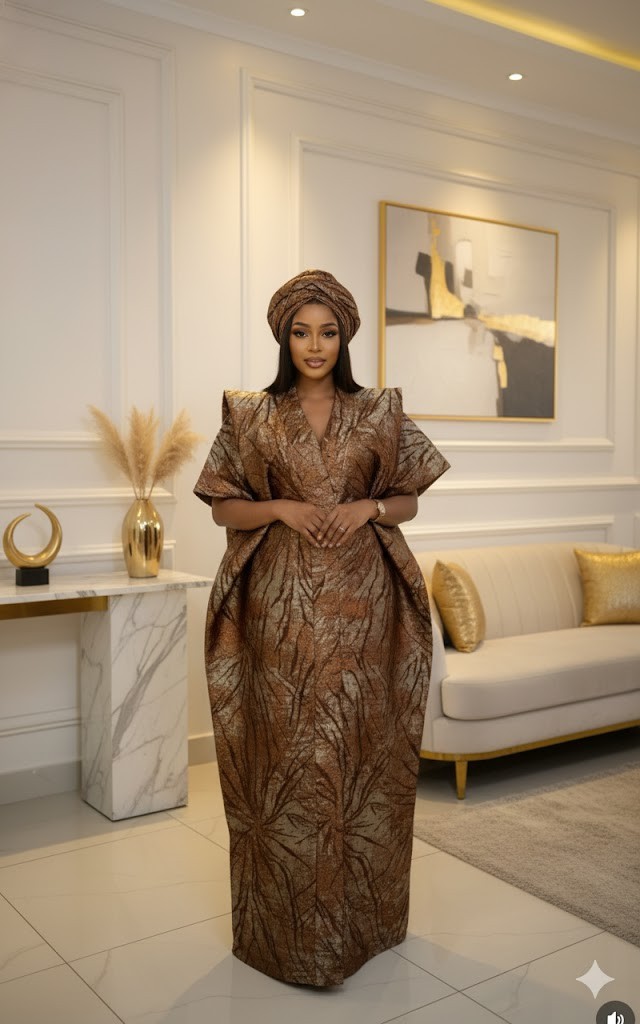 Step into effortless royalty with this luxury brown metallic brocade boubou gown, designed for women who love elegance, volume, and a timeless rich-aunty presence. This masterpiece features: 🤎 Premium Metallic Brocade Fabric – rich brown tones with shimmering gold highlights that give a soft, luxurious glow. 🤎 Signature Sculpted Boubou Silhouette – dramatic side volume and structured shoulders for that iconic queenly look. 🤎 Deep V-Neck Detail – stylish and refined, balancing the bold structure of the gown. 🤎 Matching Gele Headwrap – completing the full traditional luxury ensemble. 🤎 Graceful Floor-Length Finish – perfect for creating a royal, elongated silhouette. Ideal for weddings, traditional ceremonies, receptions, owambe parties, and all premium celebrations.