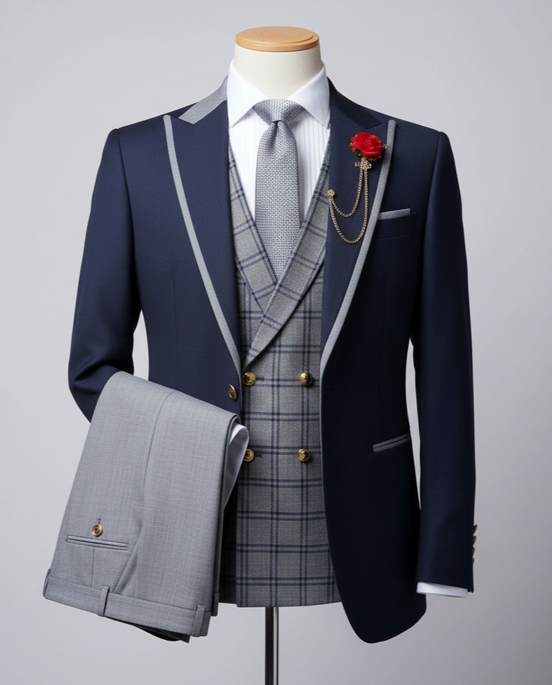 Luxury Navy Blue & Gray Checkered 3-Piece Tuxedo Suit | Slim Fit Men's Wedding & Formal Attire Product Description: The Admiral 3-Piece Suit Step into any event with unmatched elegance in The Admiral, a bespoke 3-piece suit designed for the modern gentleman. Perfect for weddings, galas, or high-stakes formal occasions, this ensemble combines classic tailoring with contemporary style elements. That's a stunning suit! Here is a detailed description and an SEO-friendly title you can use for your e-commerce platform. đ SEO Title Luxury Navy Blue & Gray Checkered 3-Piece Tuxedo Suit | Slim Fit Men's Wedding & Formal Attire đ Product Description: The Admiral 3-Piece Suit Step into any event with unmatched elegance in The Admiral, a bespoke 3-piece suit designed for the modern gentleman. Perfect for weddings, galas, or high-stakes formal occasions, this ensemble combines classic tailoring with contemporary style elements. Key Features: Feature Detail Style Modern 3-Piece Tuxedo/Formal Suit with Vest Fit Tailored Slim Fit Color Deep Navy Blue (Jacket/Trousers) and Light Grey/Dark Gray Checkered (Vest/Accents) Jacket Single-breasted, structured lapel with subtle gray trim, matching grey-trimmed pockets, and a striking gold chain accent with a decorative red lapel flower. Vest Double-breasted waistcoat in a sophisticated gray plaid/checkered pattern, featuring gold button accents. Trousers Flat-front, light gray tailored trousers. Material High-Quality Suit Fabric Blend (eg, Wool/Polyester Blend) for a sharp drape and comfortable wear. Occasion Wedding, Groom/Groomsmen Attire, Gala, Black Tie Event, Formal Business. Why You'll Love It: Distinctive Design: The contrast between the rich navy blue jacket and the checkered gray vest creates a luxurious, multi-dimensional look that stands out from a standard suit. Premium Detailing: From the polished gold chain accent to the bold red lapel rose and the elegant gray trim, every detail is crafted for high-end fashion appeal. Versatile Trousers: The light gray trousers offer a crisp, clean contrast and can be styled with other jackets for versatility. Sharp Silhouette: The slim-fit tailoring ensures a clean, modern profile that complements your figure. đ Custom-Made Service This suit is custom-made to your exact specifications for the perfect fit. Please provide the following measurements to ensure a flawless garment. Where to Measure: Measurement Instructions Chest Measure around the fullest part of your chest, under the arms, keeping the tape horizontal. Stomach/Waist (Jacket) Measure around the fullest part of your abdomen (usually just above the naval). Shoulder Width Measure straight across the back from the tip of one shoulder bone to the tip of the other. Sleeve Length Measure from the shoulder seam/tip down to where you want the cuff to rest (usually at the wrist bone). Trouser Waist Measure around your natural waistline where you normally wear your trousers. Trouser Length Measure from the top of the waistband down to the desired hem length (usually touching the top of the shoe). Hips/Seat Measure around the fullest part of your hips and rear. Height Your total height from the top of your head to the floor. Send your measurements after purchase to begin the custom tailoring process.