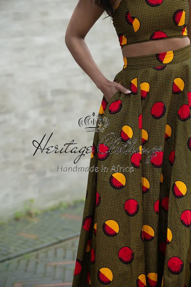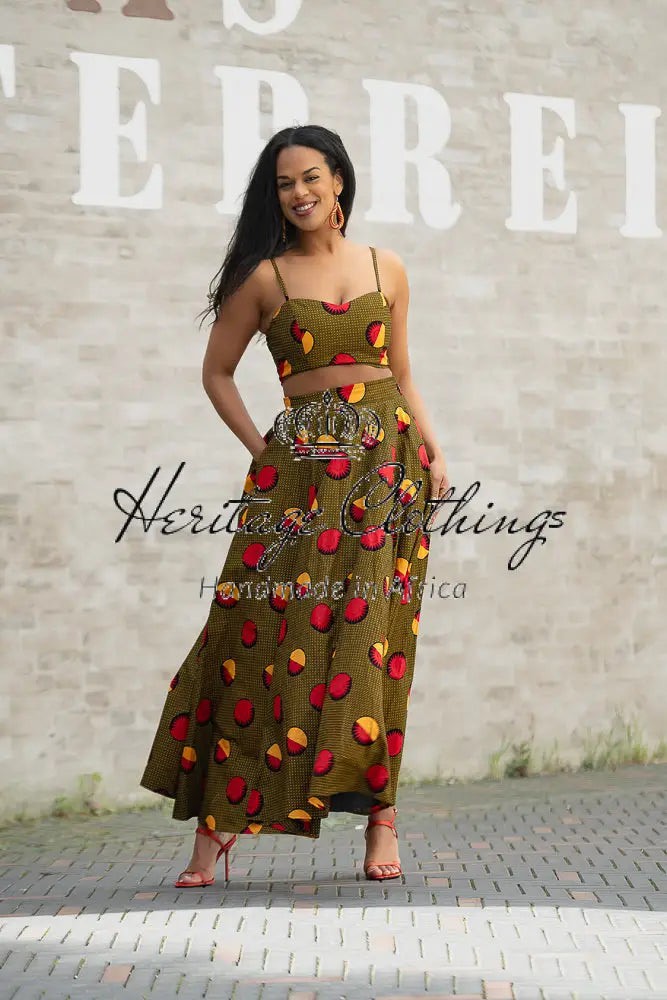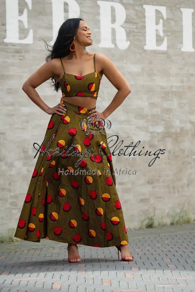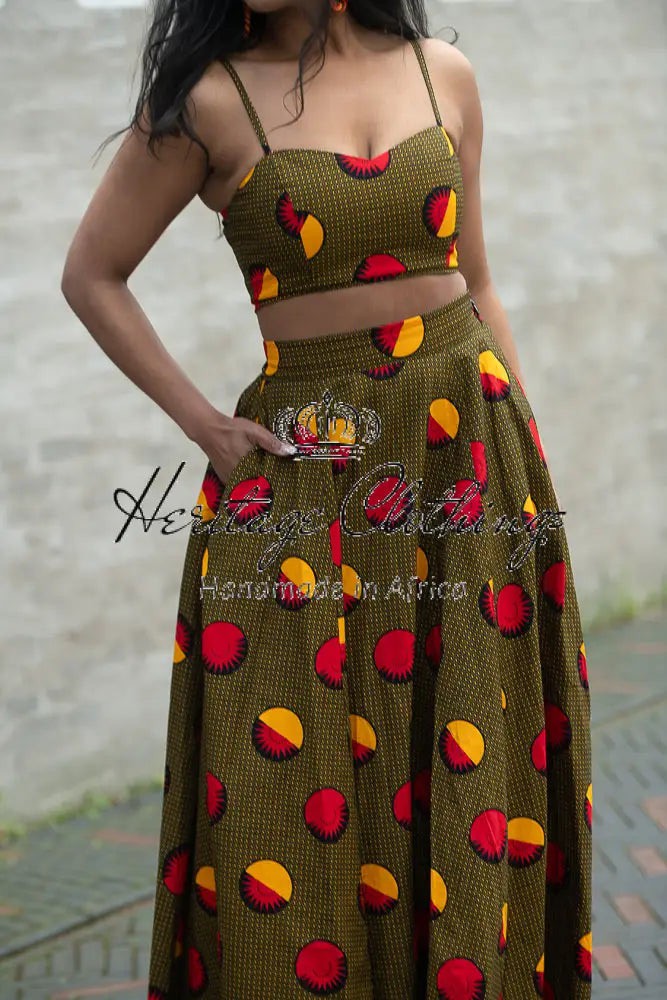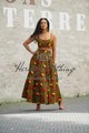 This set is pure joy in fabric form. A flattering crop top with slim straps, paired with a full, dramatic skirt that moves like a dream. The bright pops of red and yellow? They’re doing exactly what they came to do, stand out. Wear it to brunch, wear it to a party, wear it because you feel good. You deserve to wear colour like it’s your birthright.