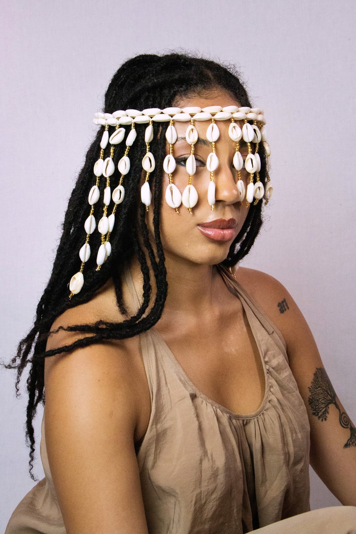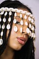 La Cascade de Cauris habille le front et descend délicatement sur le visage, en une pluie de cauris naturels finement agencés.