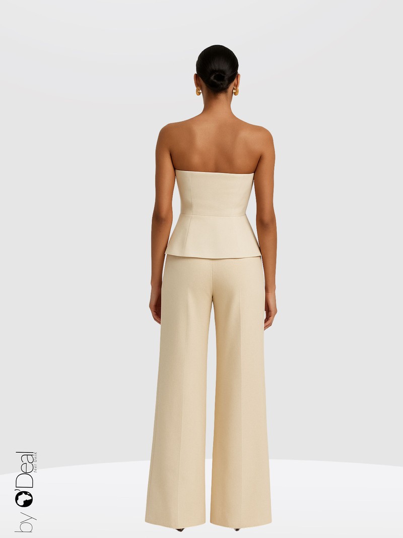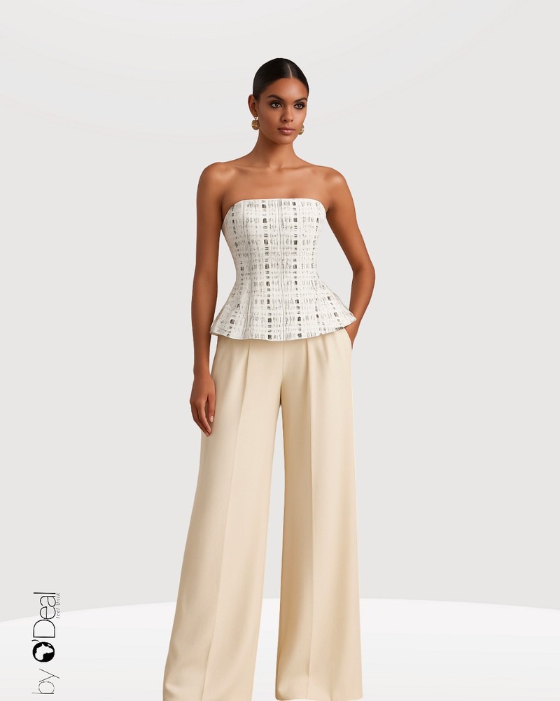 Un look chic et élégant avec cet ensemble pantalon taille haute large assorti à son top bustier.