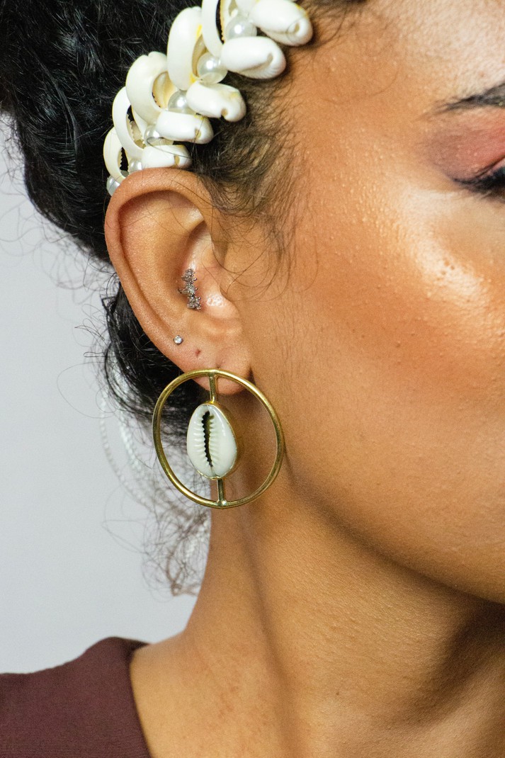 Ces boucles rondes capturent l’essence du symbole féminin : le cercle, infini et protecteur, et le cauri, ancré dans l’histoire, porteur d’abondance, de féminité et de force.