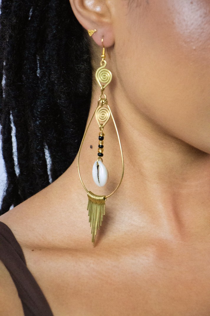 Ces boucles en laiton doré cachent un petit trésor : un cauri qui danse au centre, comme une reine sur la piste.