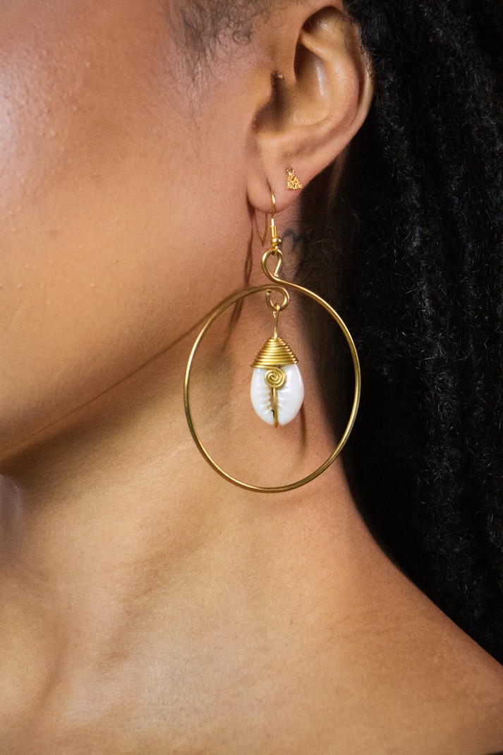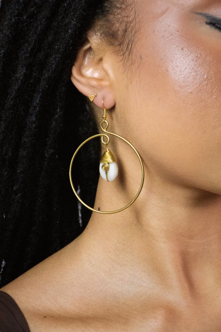 Ces boucles en laiton doré cachent un petit trésor : un cauri qui danse au centre, comme une reine sur la piste.