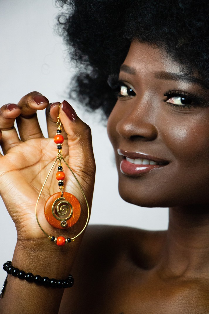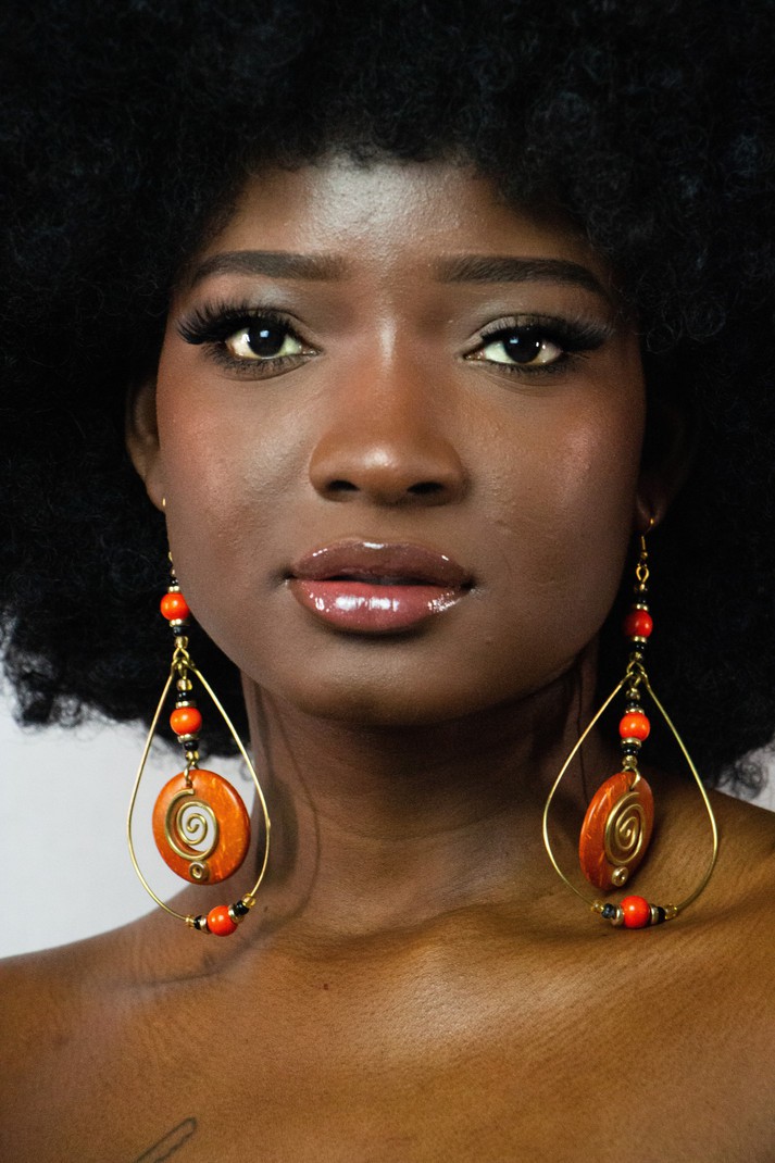 Les boucles Naya mêlent la chaleur brute de la noix de coco teintée à la noblesse du laiton doré, pour un résultat à la fois organique, vibrant et irrésistiblement élégant.