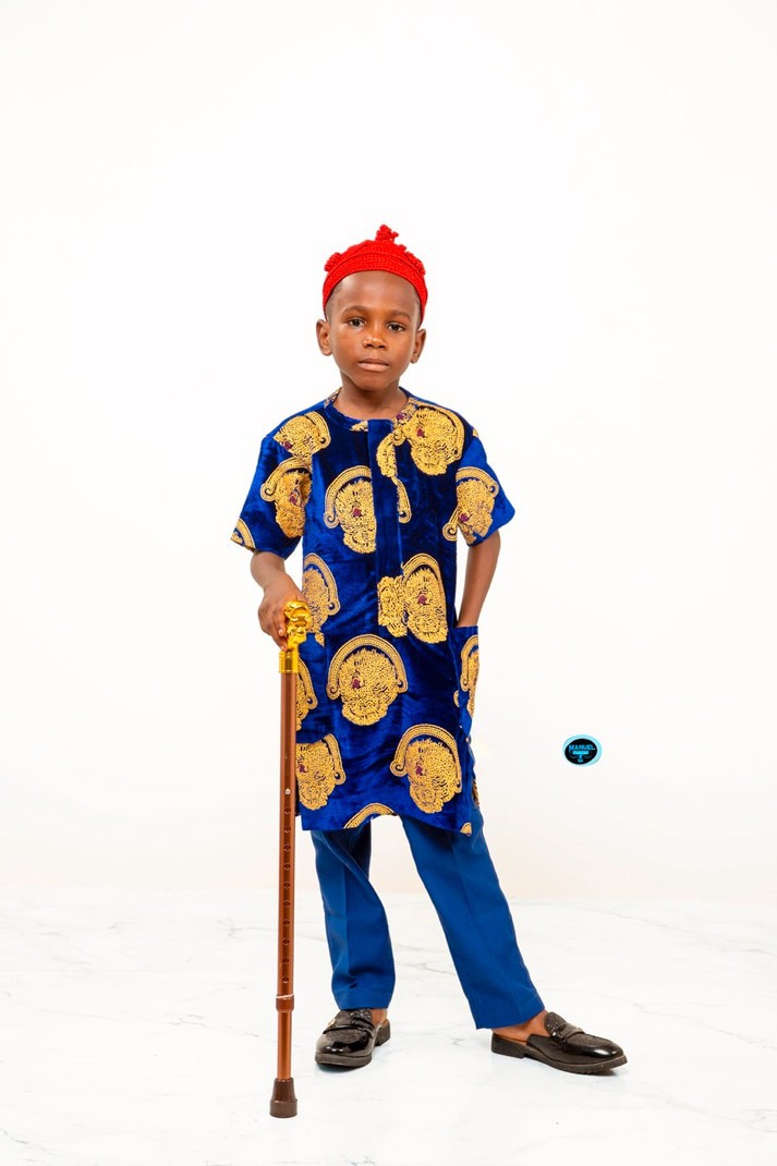 Step into regal style with the Manuel Fashion Royal Blue Traditional Tunic Set! This striking outfit features a luxurious blue tunic with intricate gold embroidery, showcasing bold, ornate patterns that exude cultural richness and prestige. Paired with matching slim-fit trousers, the set is completed with a vibrant red cap, adding a pop of color and traditional flair. Perfect for African Traditional Weddings, festivals, or cultural celebrations, this ensemble offers a comfortable fit and a sophisticated look, ideal for young trendsetters.