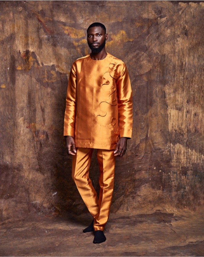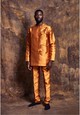 Ensemble homme composé de deux pièces couleur cuivre brûlé. Le design minimaliste est rehaussé par une broderie en relief ton sur ton, inspirée des formes organiques et du mouvement. Une longue silhouette, précise et contemporaine qui traduit une élégance royale et sobre à la fois.