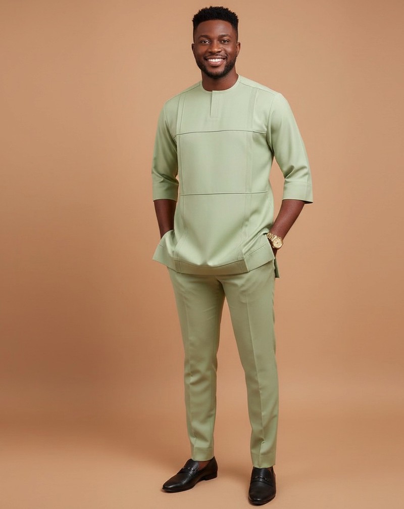 This refreshingly sophisticated, monochrome mint green set offers a modern twist on classic men's traditional attire. The two-piece outfit features a neatly tailored tunic with a distinguished band collar and comfortable three-quarter sleeves. The design is elevated by subtle, decorative horizontal seam lines across the chest and abdomen, creating a clean, segmented, and contemporary aesthetic. The tunic is complemented by a pair of perfectly matched, slim-fit trousers that maintain the seamless monochromatic look. Paired with elegant black loafers, this set is an exceptional choice for those seeking a bright, yet refined look for weddings, cultural events, or upscale casual occasions, combining traditional comfort with sharp, modern tailoring.
