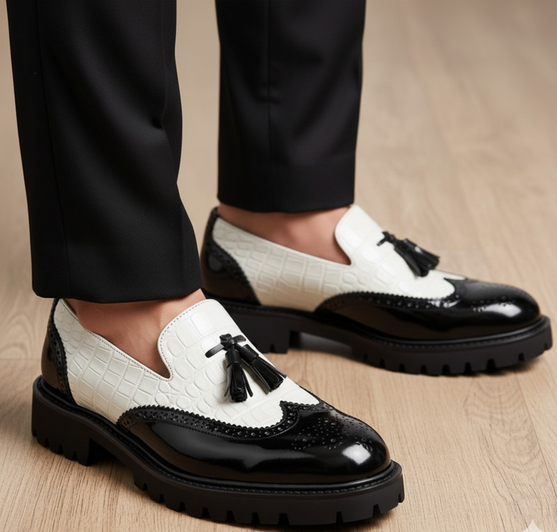 Striking Bi-Color Contrast: Glossy black patent leather toe cap meets textured white crocodile-embossed leather sides. Modern Edge: Features decorative black leather tassels and classic wingtip brogue detailing. Built to Last: Set on a prominent, chunky black lug sole for a sturdy, contemporary profile. Occasion: The ultimate statement shoe for formal events, parties, and bold sartorial choices.