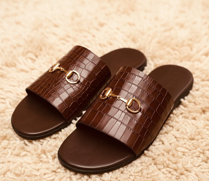 Elevate your casual style with these premium men’s brown slide sandals, featuring a croc-embossed leather strap and elegant gold horsebit hardware. Designed for comfort and sophistication, these slip-on sandals are perfect for everyday wear, outings, or polished casual looks. Durable, stylish, and easy to pair with any outfit your new go-to footwear for effortless luxury.
