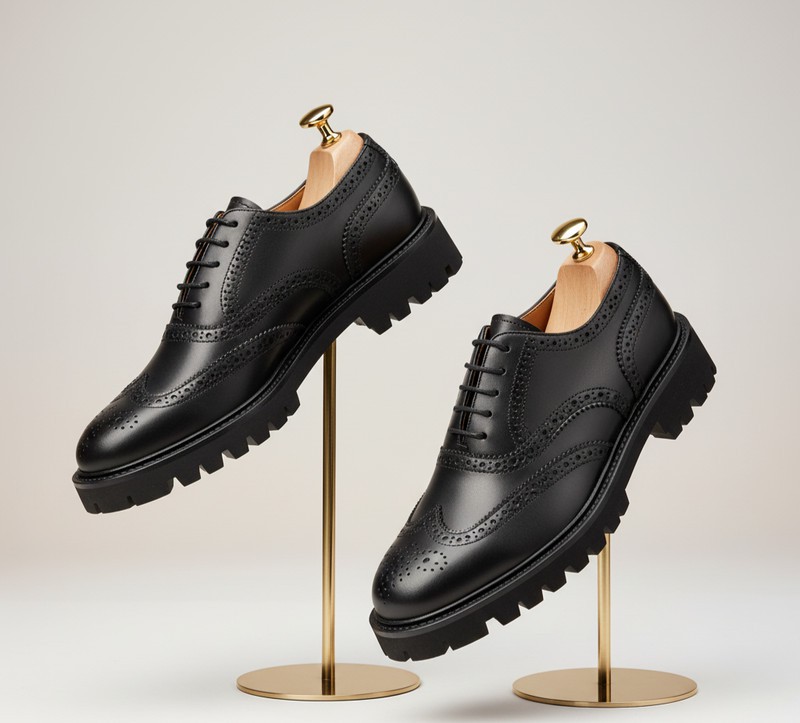 A modern take on the classic formal shoe. These lace-up wingtip brogues feature smooth, matte black leather and traditional perforation detailing. The design is grounded by a chunky, heavily lugged rubber sole, adding contemporary edge, durability, and robust comfort to a timeless silhouette. Perfect for smart-casual wear, business casual, or stepping up your street style.