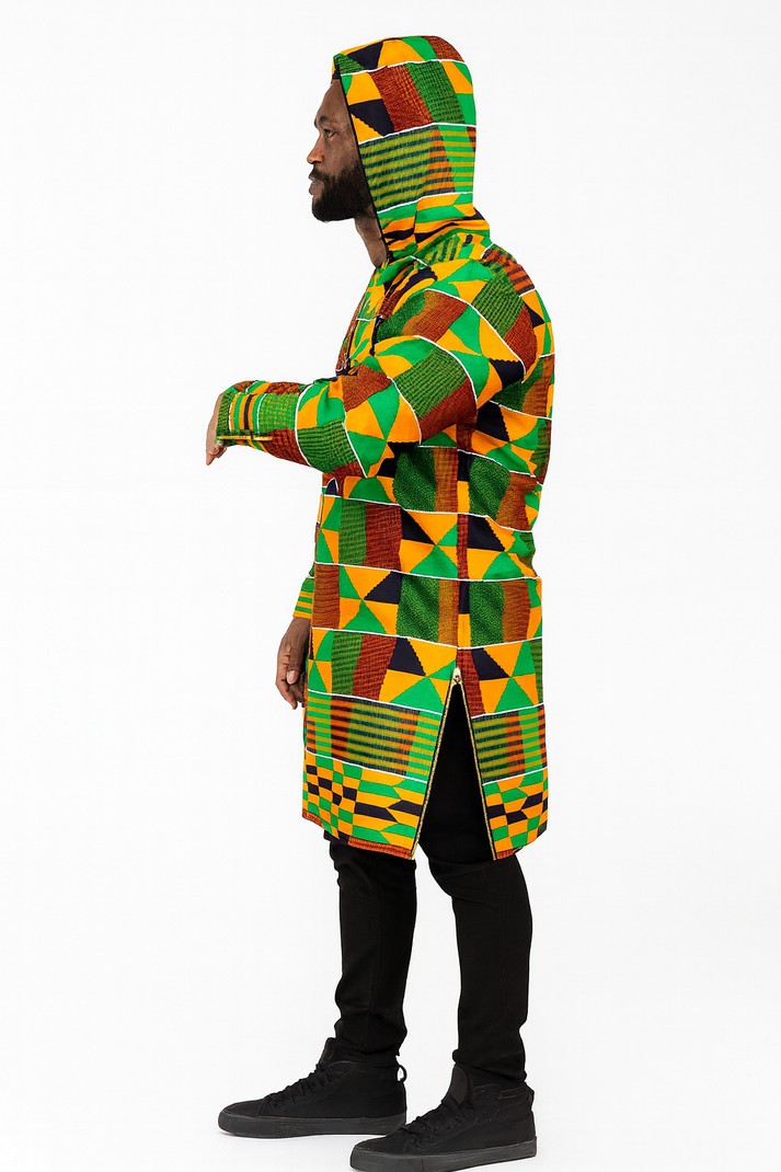 This men’s long African print hoodie jacket is crafted for buyers who appreciate bold cultural fashion and premium finishing. Designed with vibrant Kente-inspired patterns, it combines traditional aesthetics with a modern longline silhouette, making it a standout piece for fashion boutiques, cultural stores, and online retailers.