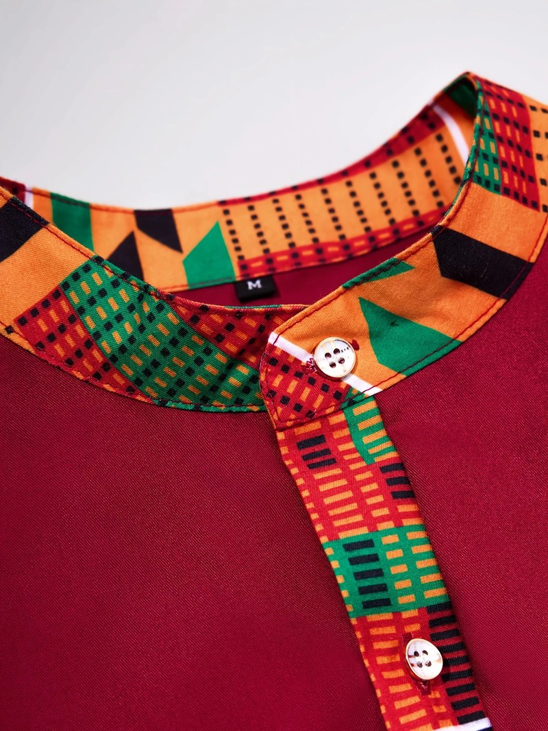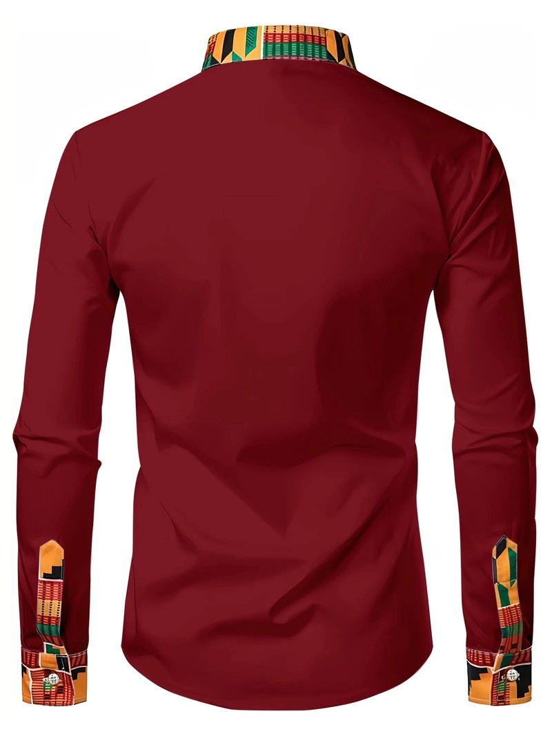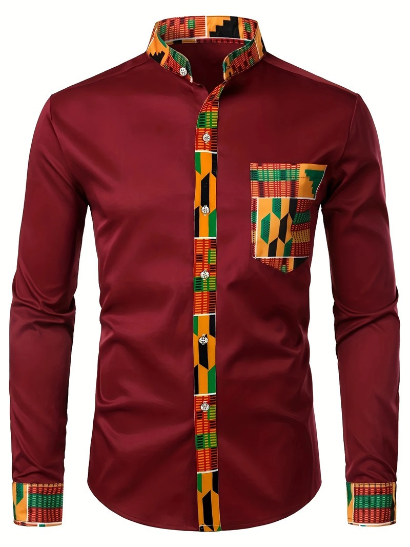 Men'S Long Sleeve Dress Shirt, Ethnic Print, Stand Collar, Regular Fit, Polyester, All Seasons, Mature Style, Woven Fabric, Button Detail