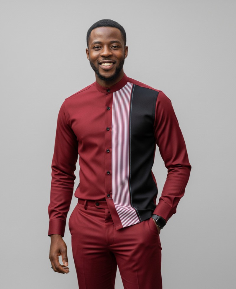 Contemporary Style: The Premium Maroon Suit Set Step out in confidence with this exceptionally tailored two-piece set, featuring a unique, modern design perfect for any special occasion. Whether it's a formal event, a wedding, or a sophisticated social gathering, this outfit ensures you make a memorable, stylish impression. Key Features Mandarin Collar: The sleek, band-style collar offers a clean, contemporary alternative to a traditional shirt collar, enhancing its modern aesthetic. Unique Panel Detailing: A striking vertical panel runs down the front of the shirt, incorporating three distinct textures/colors: Solid Black on the shoulder and chest. Bold Black & White Stripes creating a dynamic visual contrast. Solid Maroon that matches the rest of the shirt and pants. High-Quality Fabric: Crafted from a premium, smooth fabric (likely a poly-blend or cotton-blend) that drapes beautifully and maintains a sharp, wrinkle-resistant look. Color Palette: A rich, deep Maroon/Burgundy color that is both elegant and eye-catching. Design & Fit Shirt: Long sleeves with buttoned cuffs and a full-button placket that is partially hidden by the central panel detail. The fit is modern and flattering. Trousers: Perfectly matched, tailored trousers that complete the streamlined silhouette. Occasion Suitability Formal Events (Black Tie Optional, Galas) Weddings (Guest or Groomsmen Attire) Business/Executive Functions Church/Religious Events Care Instructions Please include specific care instructions for your garment, such as "Dry Clean Recommended" or "Machine Wash Cold."