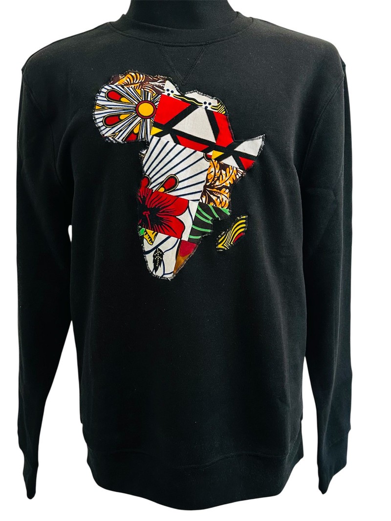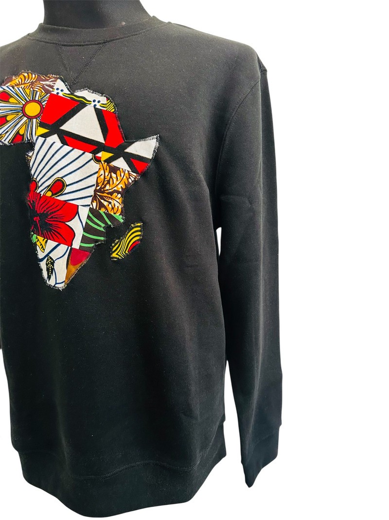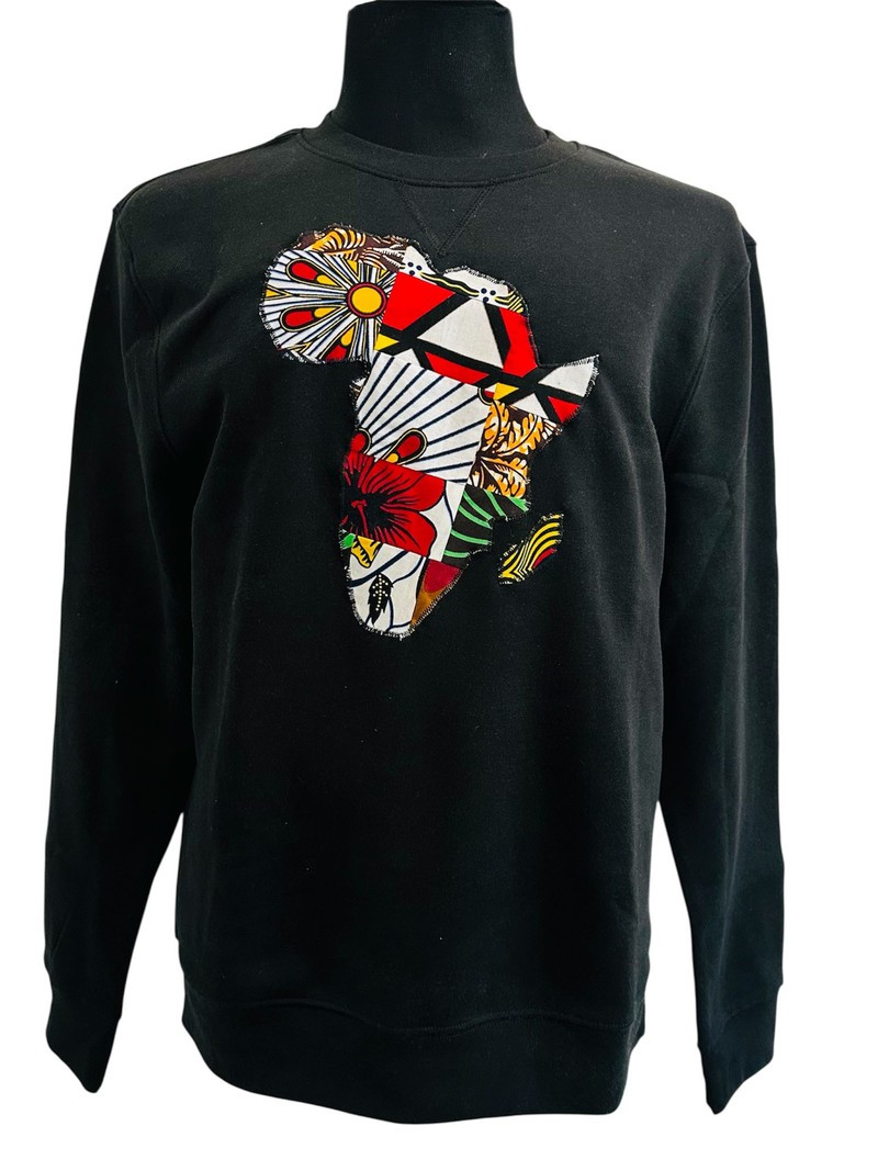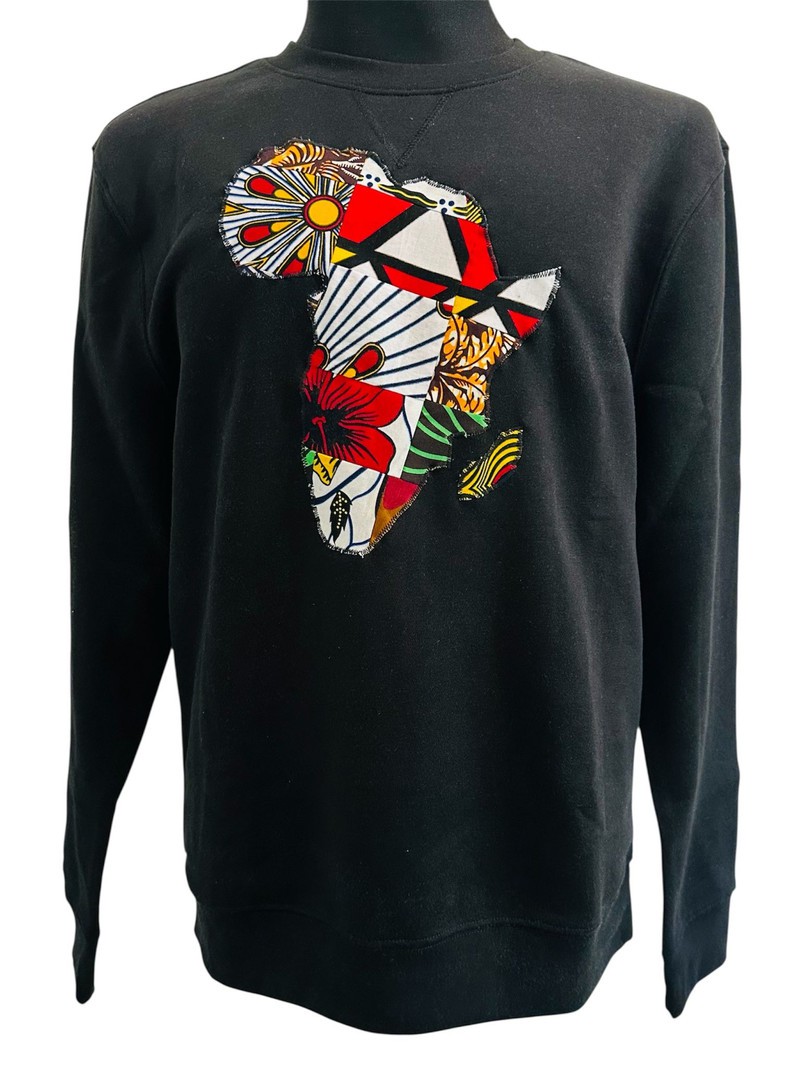Affirmez votre style avec ce sweat-shirt unique customisé d’une magnifique carte de l’Afrique en wax.