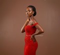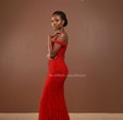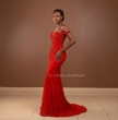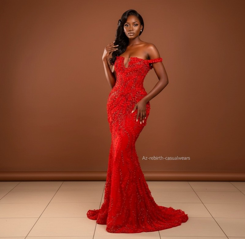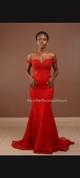 This is a beautiful off-shoulder mermaid gown in a vibrant red. The dress is intricately detailed and would be perfect for a formal event. It's available in all sizes!