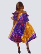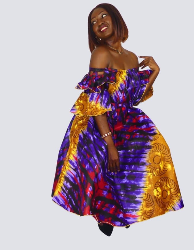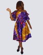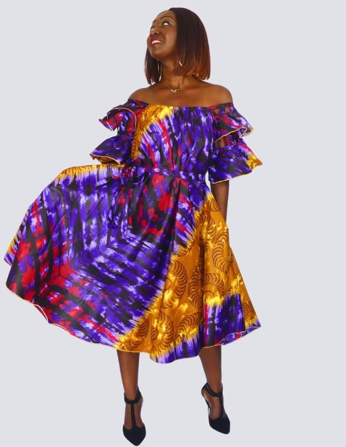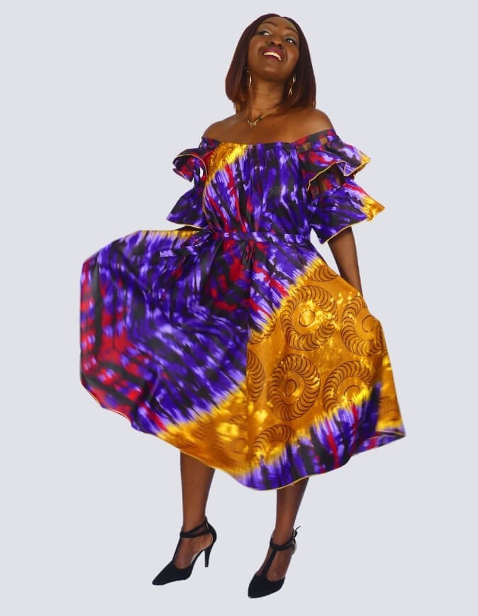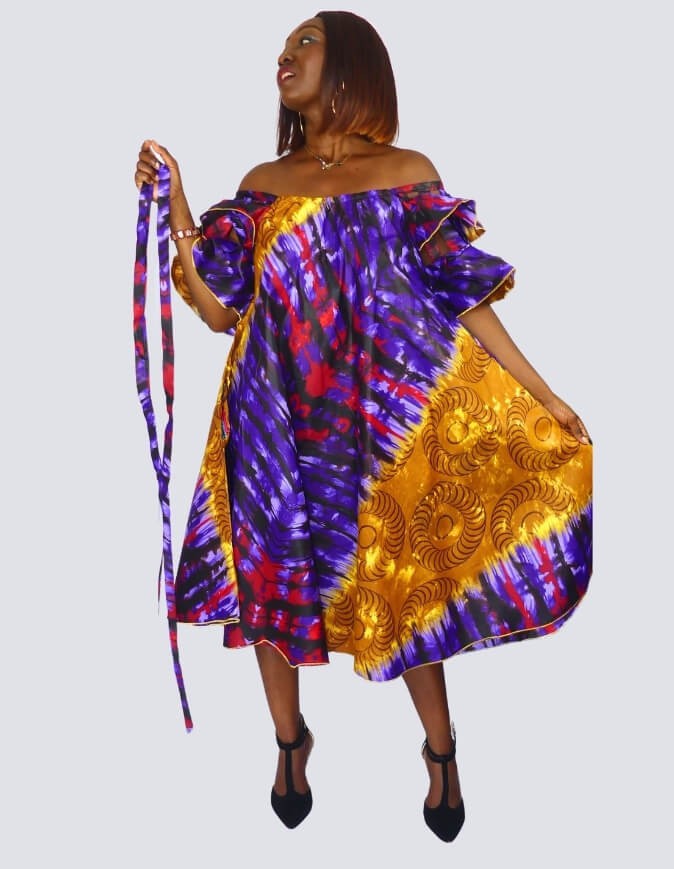 Très Jolie robe évasée imprimée en bazin mi-longue. Manches courtes, évasée, ce qui permet une meilleure aisance et la possibilité d’enfiler la robe quelque soit la taille. La robe est évasée, légère et Idéale pour l’été, se porte en toute occasion. Cordon à nouer autour de la taille.
