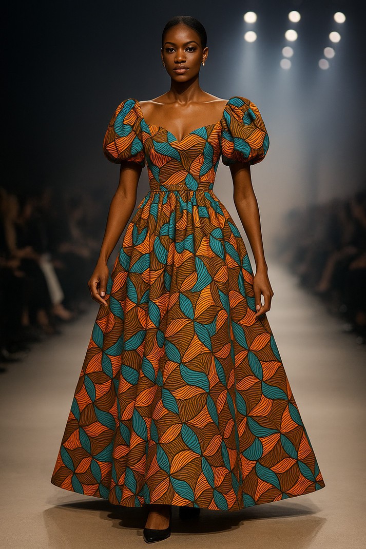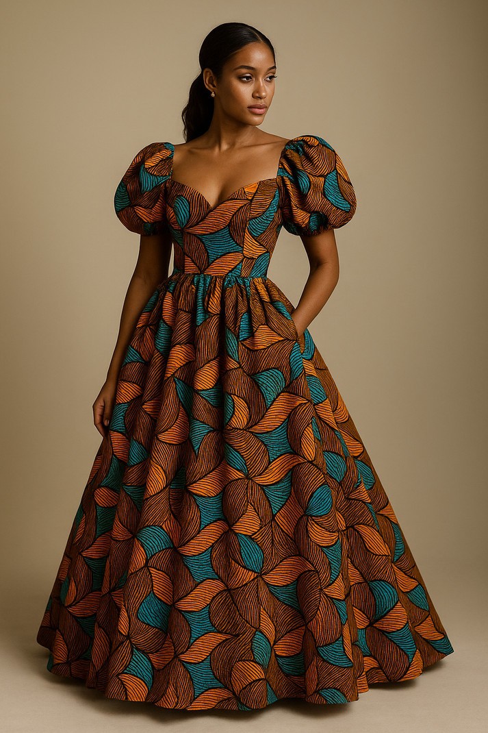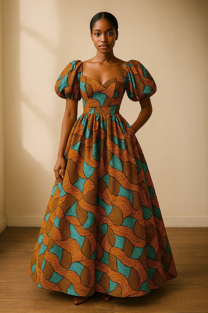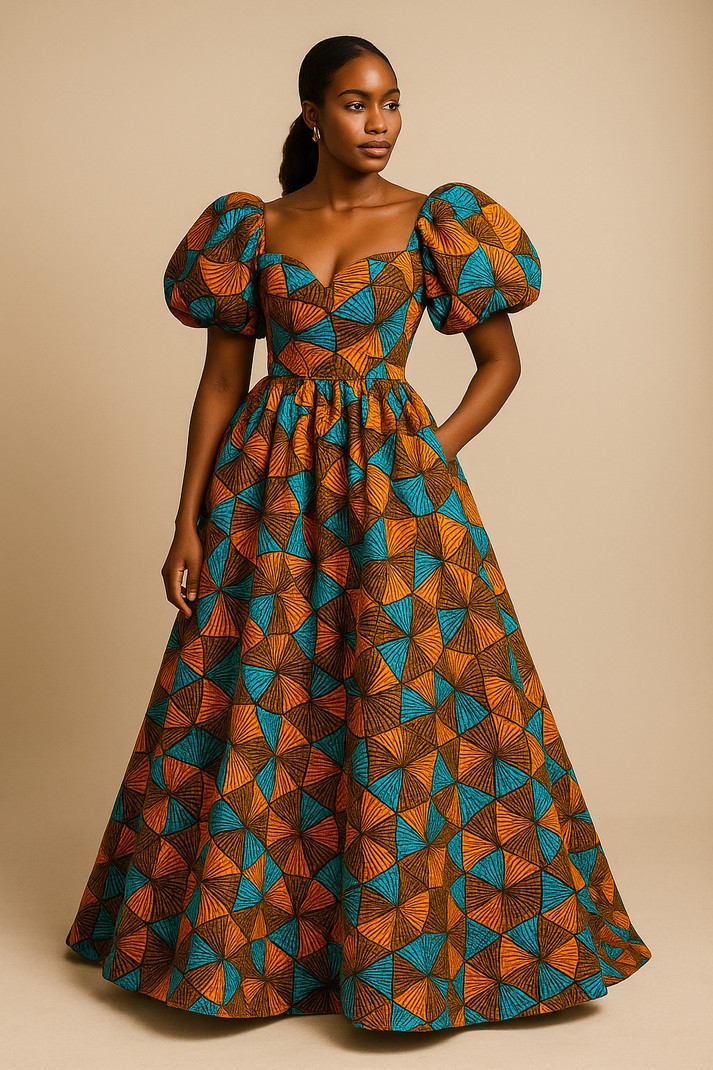 Robe longue royale en wax – Manches bouffantes & imprimé graphique