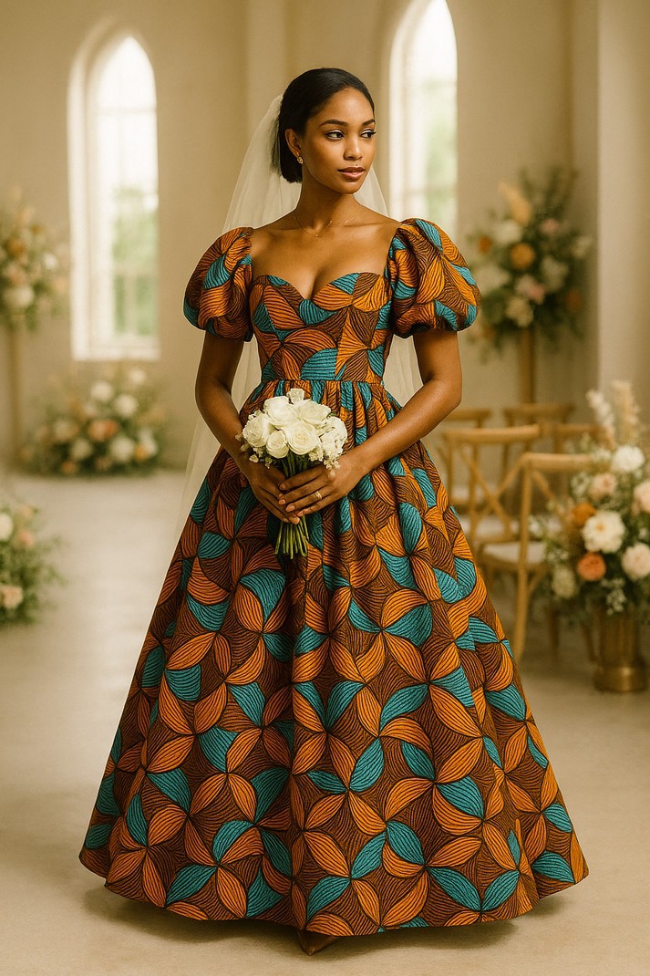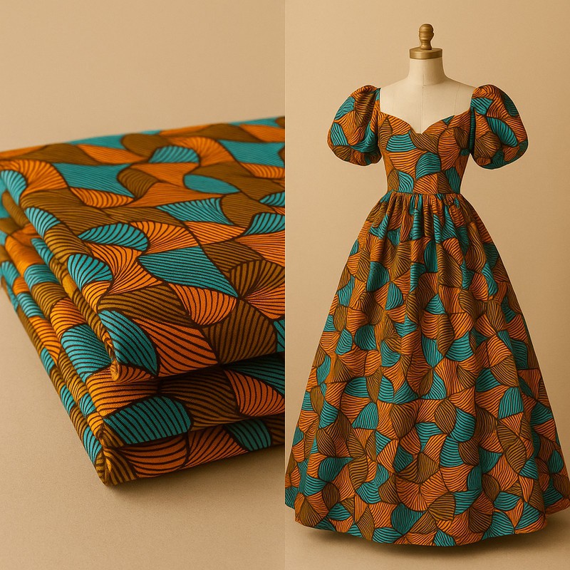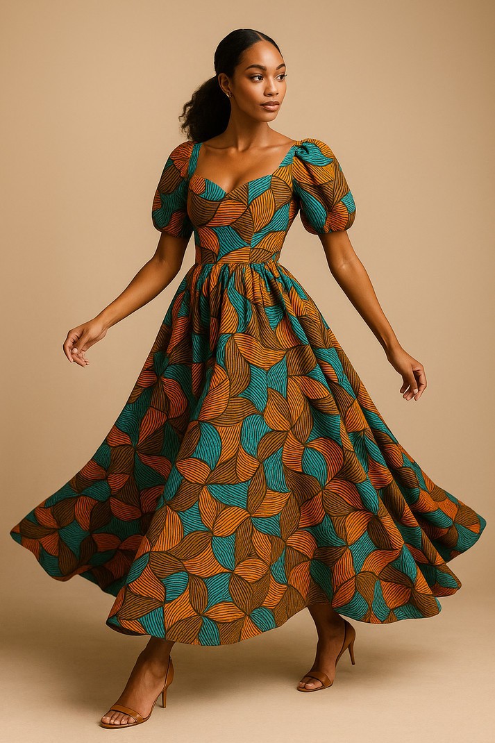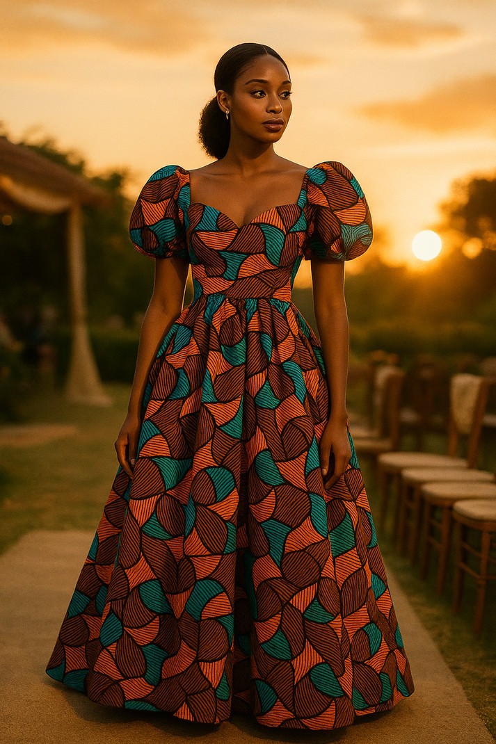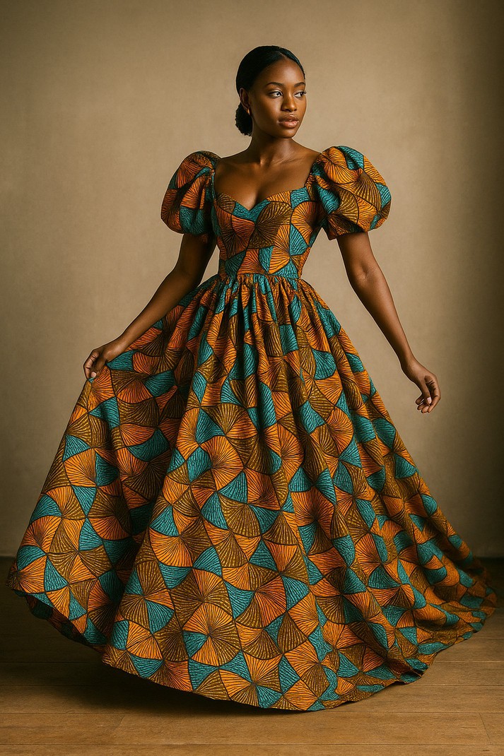 Robe longue royale en wax – Manches bouffantes & imprimé graphique