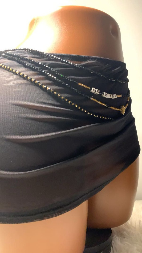 Ce lot est un ensemble de quatre chaînes de taille superposées (bayas ou bine-bines), conçu pour une allure raffinée et mystérieuse. Il combine des perles traditionnelles avec une touche de personnalisation moderne. L'ensemble joue sur le contraste classique et intemporel du noir profond et de l'or brillant. Le noir apporte élégance et discrétion, tandis que les perles dorées ajoutent une lumière précieuse. Une des chaînes est agrémentée de perles à lettres blanches formant le mot "LE MIEL", ajoutant un message doux et personnel qui célèbre la féminité et la sensualité. Quatre bayas sont composées principalement de perles facetées noires, offrant un éclat subtil à chaque mouvement, entrelacées de perles dorées fines. Une chaîne se distingue par son mot personnalisé et un petit pendentif en forme de cœur doré, renforçant l'aspect affectif et intime du bijou. Idéal pour le port sous les vêtements ou la lingerie, il est parfait pour souligner la taille et les hanches avec une touche de luxe discret. Il s'inscrit dans la tendance du layering ) pour un effet de volume captivant. Matériau : élastique Taille : XL Contenu : 4 bijoux