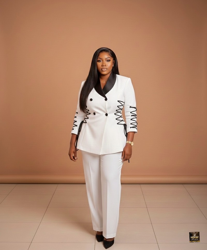 However, the true showstopper is the intricate corset-style lacing that runs down the sides of the waist and along the sleeves. Threaded through bold black grommets, this detailing not only adds visual drama but allows for a customized, snatched fit that accentuates your curves. Paired with clean, straight-leg white trousers, this suit is designed for the woman who wants to look polished.