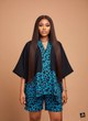 This striking two-piece set features a bold, contemporary design that merges classic black with a vibrant animal print. The top is a loose-fitting, black kimono-style tunic characterized by dramatic, wide sleeves and an open V-neckline. The lower half of the top and the entire matching pair of tailored shorts are rendered in an eye-catching teal-blue and black abstract giraffe or mosaic pattern, creating a dynamic contrast against the solid black upper section. This clever use of color blocking and pattern placement gives the ensemble a modern, effortlessly chic aesthetic. The fabric appears smooth and drapes well, suggesting comfort without sacrificing style, making this set a fashion-forward choice for warm weather. It is a cohesive and stylish look that perfectly balances solid structure with playful print. This vibrant kimono and shorts set is ideally suited for casual and trendy warm-weather occasions. It is a fantastic choice for summer holidays, pool parties, resort wear, or weekend outings like festivals and stylish brunches. The comfortable fit and bold print also make it suitable for casual daytime events where a statement outfit is desired. Material: crepe & Ankara Color: Blue
