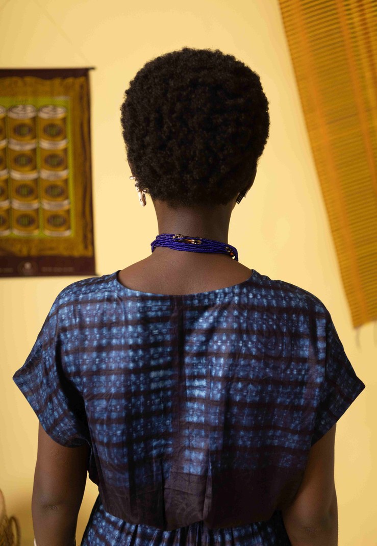 La teinture est faite à la main. Les motifs et les couleurs ont été créés, à notre demande, par une teinturière sénégalaise.