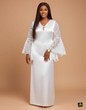 Step into timeless elegance with our Graceful White Maxi Gown, a masterpiece designed for sophisticated and memorable occasions. The body of this floor-length dress is meticulously crafted from a premium, smooth Satin fabric, providing a luxurious drape and a subtle, flattering sheen that catches the light beautifully. The gown's most captivating feature is its dramatic Lace Bell Sleeves, fashioned from intricate floral Lace that creates a sheer, romantic contrast to the smooth satin body, culminating in a striking, vintage-inspired silhouette. With its modest V-neckline and elegant, clean lines, this gown is an ideal choice for a range of formal settings, including solemn church ceremonies, engagement parties, bridal showers, sophisticated rehearsal dinners, formal evening events, or as an elegant second wedding reception dress.