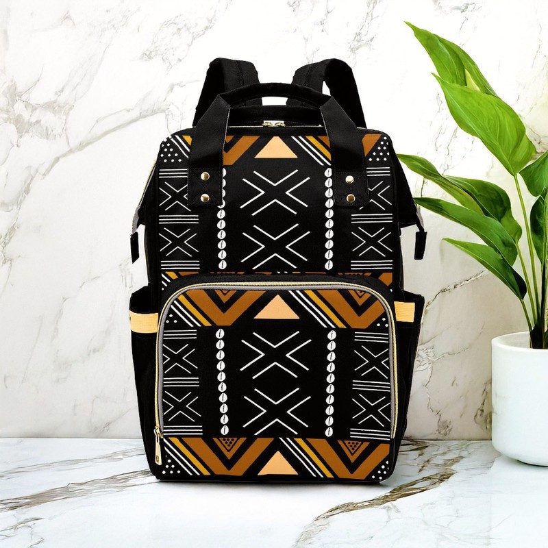 Make a statement with our daring Mud Cloth Cowrie African Print Backpack. This Afrocentric bag is not for the faint of heart - its bold print and intricate cowrie detailing embody the spirit of adventure and risk-taking. Perfect for those who want to stand out and make a statement. Product Description * Made from high-grade nylon, lightweight yet sturdy. * Wide open design, large interior with 1 zippered pocket and 4 elastic pockets. * One front section with 3 elastic pockets and 1 net pocket for milk bottles and other items. * Padded back panel and adjustable shoulder straps for ultra comfort and stability. * Unisex design makes the diaper bag a nice choice for both mom and dad. Delivery Time This item will be processed within 3-7 business days (Excluding Weekends and Holidays). Once products ships it can take up to 15 Business days depending on your location. Out of Stock items can be requested by emailing us at [email protected] Care Instructions Machine wash cold inside out. Gentle cycle with mild detergent and like colors. Do not use bleach or fabric softener. Do not tumble dry. Hang to dry to ensure maximum shelf life. Iron inside out if necessary. Do not iron the print. Do not dry clean.