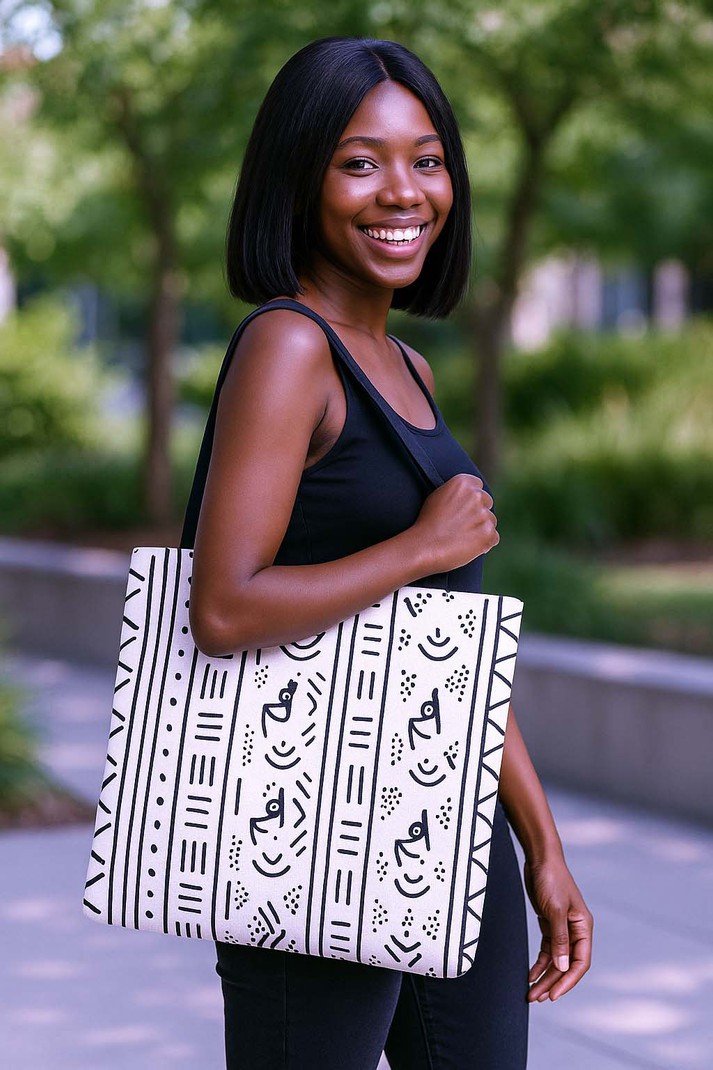 Embrace your adventurous spirit with our Mud Cloth Geometric Afrocentric Tote Bags! Featuring a bold Afrocentric design and a large capacity, this tote bag is perfect for carrying all your essentials with style. Get ready to stand out from the crowd and make a statement with our Afro Fashion White tote bag! Product Description • 510 g/m2. Made from high-grade canvas. • Durable and roomy enough for your daily items. • Lightweight canvas tote bag with sturdy handle is easy to carry. • Perfect for shopping and carrying your essentials. Delivery Time This item will be processed within 3-7 business days (Excluding Weekends and Holidays). Once products ships it can take up to 15 Business days depending on your location. Out of Stock items can be requested by emailing us at [email protected] Care Instructions Machine wash cold inside out. Gentle cycle with mild detergent and like colors. Do not use bleach or fabric softener. Do not tumble dry. Hang to dry to ensure maximum shelf life. Iron inside out if necessary. Do not iron the print. Do not dry clean.