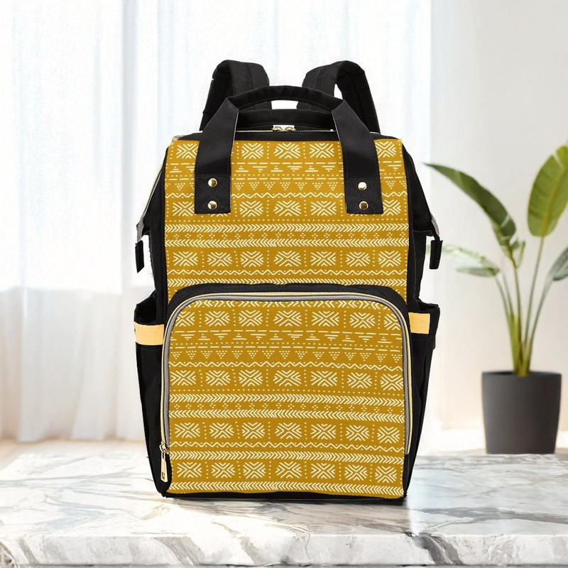 Embrace adventure and stand out with our Mud Cloth Minimalist Traditional Backpack. Designed with a boho fashion sense, this backpack is perfect for both everyday use and as a diaper bag. Made with traditional mud cloth, it adds a unique touch to your style. Go bold, take risks, and make a statement! Product Description * Made from high-grade nylon, lightweight yet sturdy. * Wide open design, large interior with 1 zippered pocket and 4 elastic pockets. * One front section with 3 elastic pockets and 1 net pocket for milk bottles and other items. * Padded back panel and adjustable shoulder straps for ultra comfort and stability. * Unisex design makes the diaper bag a nice choice for both mom and dad. Delivery Time This item will be processed within 3-7 business days (Excluding Weekends and Holidays). Once products ships it can take up to 15 Business days depending on your location. Out of Stock items can be requested by emailing us at [email protected] Care Instructions Machine wash cold inside out. Gentle cycle with mild detergent and like colors. Do not use bleach or fabric softener. Do not tumble dry. Hang to dry to ensure maximum shelf life. Iron inside out if necessary. Do not iron the print. Do not dry clean.