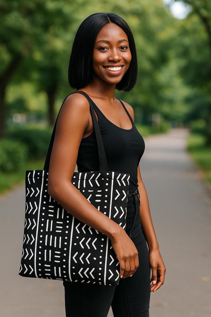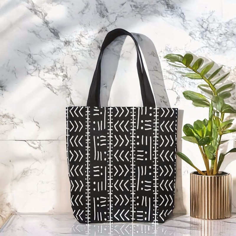 Go bold with our Mudcloth African Tote Bag! This tribal accessory is perfect for those who love to take risks and stand out from the crowd. With a large capacity, you can carry all your essentials on your next adventure. Add a touch of adventure to your style with this unique tote bag! Product Description • 510 g/m2. Made from high-grade canvas. • Durable and roomy enough for your daily items. • Lightweight canvas tote bag with sturdy handle is easy to carry. • Perfect for shopping and carrying your essentials. Delivery Time This item will be processed within 3-7 business days (Excluding Weekends and Holidays). Once products ships it can take up to 15 Business days depending on your location. Out of Stock items can be requested by emailing us at [email protected] Care Instructions Machine wash cold inside out. Gentle cycle with mild detergent and like colors. Do not use bleach or fabric softener. Do not tumble dry. Hang to dry to ensure maximum shelf life. Iron inside out if necessary. Do not iron the print. Do not dry clean.
