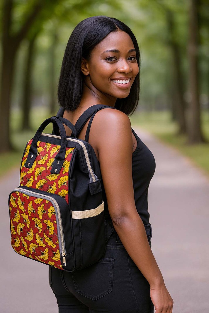 Explore the world in style with our Multicolored Ankara Backpack! Stand out from the crowd and embrace your adventurous spirit with the vibrant floral print and bold Afrocentric fashion design. This backpack is not only a fashion statement, but also a functional and durable travel companion for all your daring escapades! Product Description * Made from high-grade nylon, lightweight yet sturdy. * Wide open design, large interior with 1 zippered pocket and 4 elastic pockets. * One front section with 3 elastic pockets and 1 net pocket for milk bottles and other items. * Padded back panel and adjustable shoulder straps for ultra comfort and stability. * Unisex design makes the diaper bag a nice choice for both mom and dad. Delivery Time This item will be processed within 3-7 business days (Excluding Weekends and Holidays). Once products ships it can take up to 15 Business days depending on your location. Out of Stock items can be requested by emailing us at [email protected] Care Instructions Machine wash cold inside out. Gentle cycle with mild detergent and like colors. Do not use bleach or fabric softener. Do not tumble dry. Hang to dry to ensure maximum shelf life. Iron inside out if necessary. Do not iron the print. Do not dry clean.
