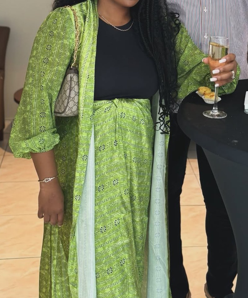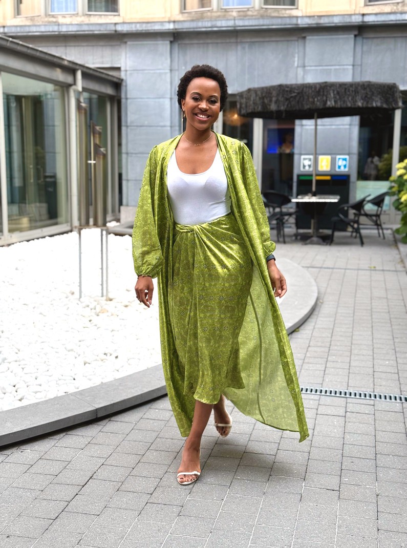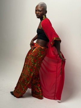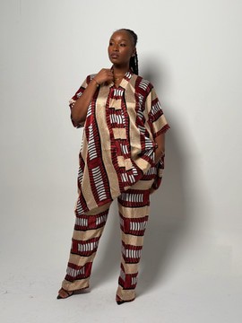 - Set with African motifs - Long kimono with an elegant cut - Slightly transparent sleeves and elasticated cuff finish - Adjustable pareo skirt, offering a personalized style thanks to the integrated stripes