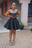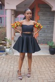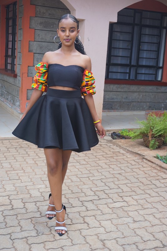 This two piece is made from the spongey scuba fabric for the Circular Cute skirt andour off shoulder crisis cross top , which has kente arms.