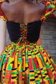 Ce deux pièces est fabriqué à partir du tissu de plongée éponge pour la jupe Circular Cute et notre haut croisé à épaules dénudées, qui a des bras kente. .Avec le detsil croisé de crise dans le dos .Top à l'épaule 100% coton Ankara
