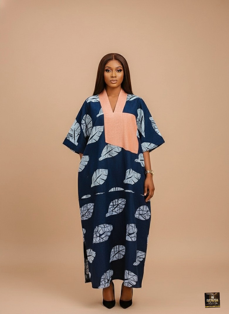 An elegant navy Adire print kaftan showcasing a bold, large leaf pattern in a light grey/blue. The design is accentuated by a contrasting peach-colored V-neck panel, adding warmth and a modern color block effect. The kaftan falls to the ankle, offering a graceful, relaxed fit. Ideal for Brunches, day parties, or stylish work-from-home appeal. Material: Ankara batik Color: Blue
