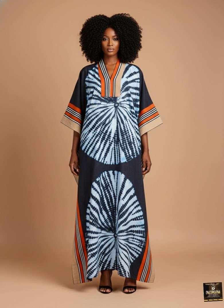 Radiate sophistication in this navy blue spiral-patterned kaftan, designed with a mesmerizing tie-dye effect. The large circular patterns create an eye-catching visual appeal, complemented by striking orange and beige striped borders. Featuring a deep V-neckline and wide sleeves, this flowy kaftan blends modern design with traditional artistry. It's perfect for elegant casual wear, beachside relaxation, or cultural events where comfort meets class. Material: Ankara,handwoven aso-oke Color: Multicolor