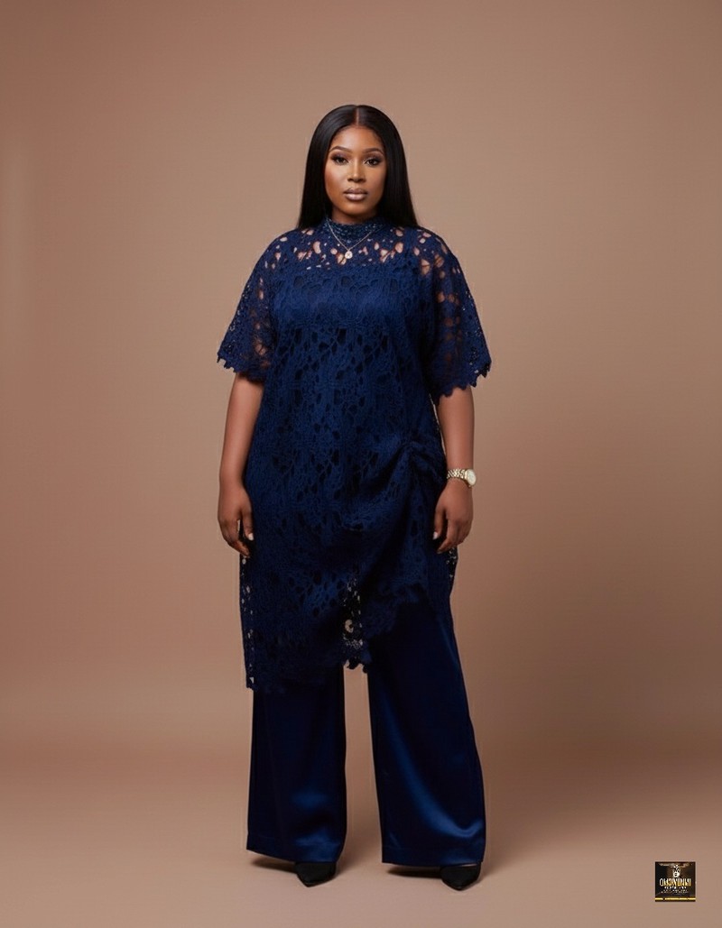 A masterclass in monochromatic texture. This elegant set pairs a heavy navy blue guipure lace top with a jagged, modern hemline against the smooth fluidity of navy satin wide-leg trousers. The high neckline and short sleeves offer modesty, while the mix of lace and satin provides a rich, expensive feel.