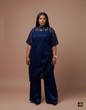 A masterclass in monochromatic texture. This elegant set pairs a heavy navy blue guipure lace top with a jagged, modern hemline against the smooth fluidity of navy satin wide-leg trousers. The high neckline and short sleeves offer modesty, while the mix of lace and satin provides a rich, expensive feel. Perfect For, Evening galas, mother of the bride/groom, or formal dinners Material: Lace & Satin Color: Blue