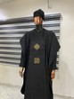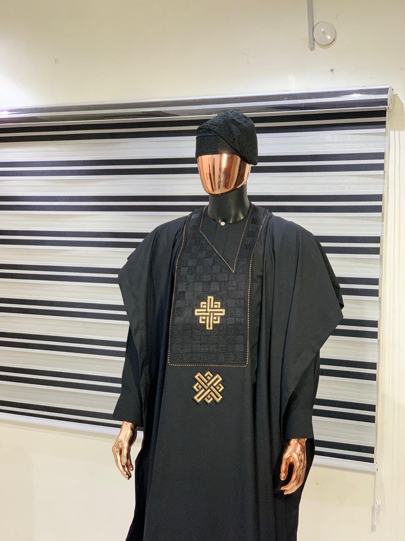 A black, metallic gold “Benin Crest” embroidered, agbada with black long-sleeved kaftan top and matching pants