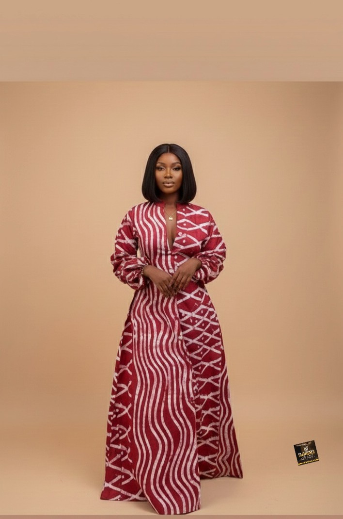 Make a stunning entrance in this sophisticated maxi-length gown, a masterpiece of artisanal texture and modern design. The garment is meticulously handcrafted from premium burgundy hand-dyed Adire cotton, featuring a striking split-pattern aesthetic with fluid, wave-like rhythms on one side and structured geometric motifs on the other. The silhouette is defined by a contemporary mandarin-style collar, a plunging V-neckline, and dramatic long puff sleeves that add a touch of romantic volume to the tailored bodice. This breathable and culturally rich ensemble is an ideal choice for high-profile corporate dinners, traditional wedding receptions, or exclusive gala events where you want to project a regal and effortlessly polished presence.