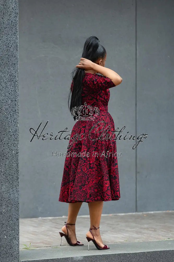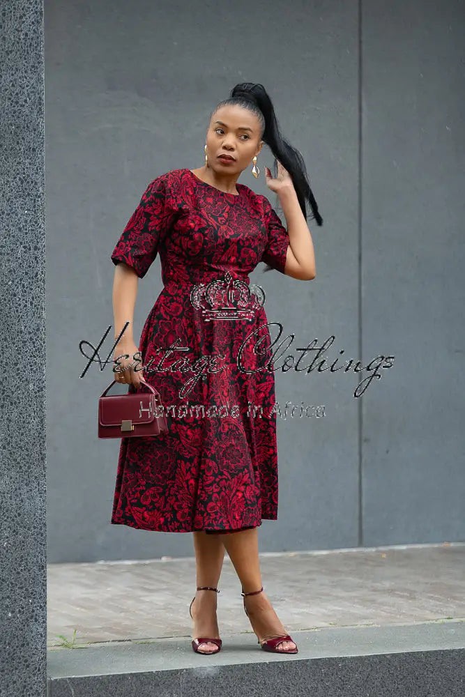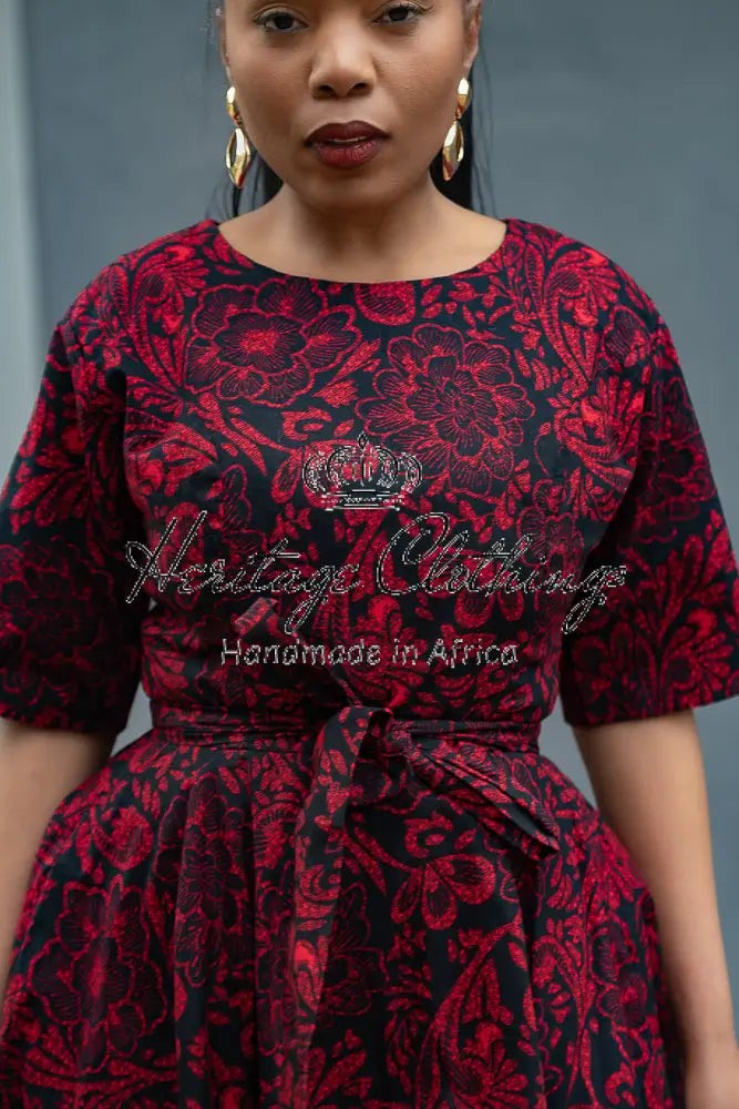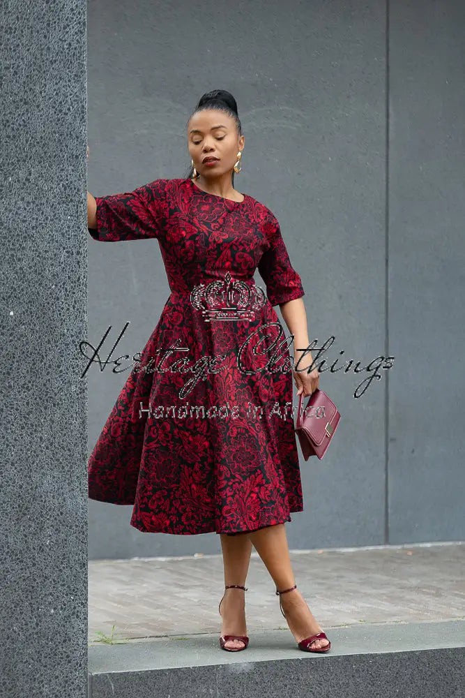The print is a deep nourishing red with stunning floral blood red pattern made with velvety fabric that's striking- you aren't trying to hide wearing this gorgeous dress (even when you're trying to keep low-key). It's comfortable and flattering for all body shapes. You'll definitely enjoy the deep side pockets to keep your phone and car keys. Dress up with peep-toe heels.