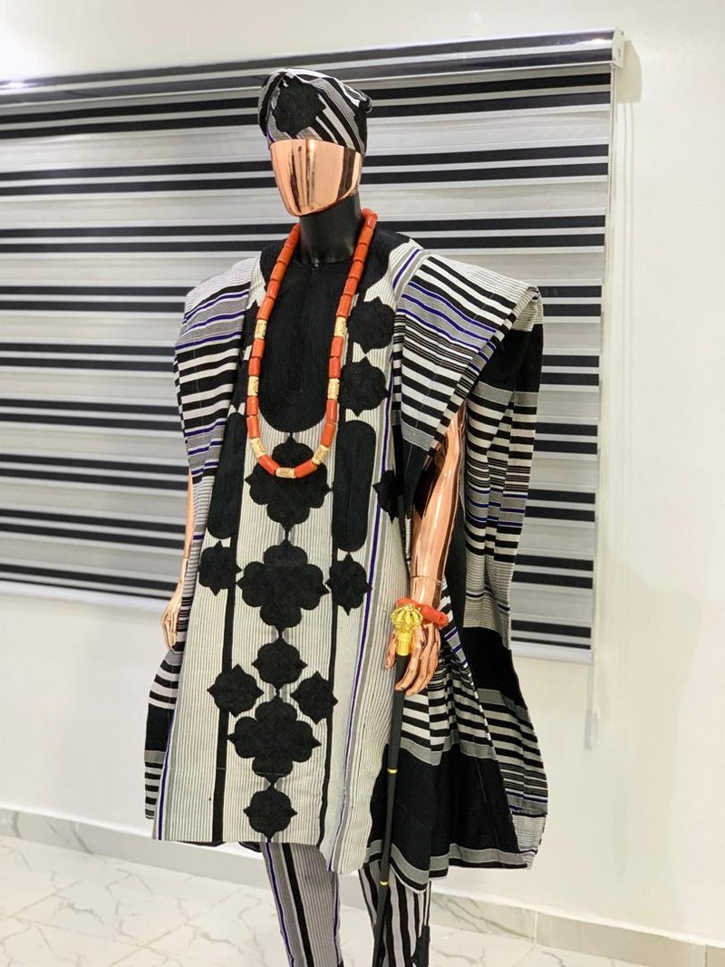 A handwoven Aso-oke, Eyo Royale embroidered, Agbada with matching handwoven danshiki and pants