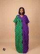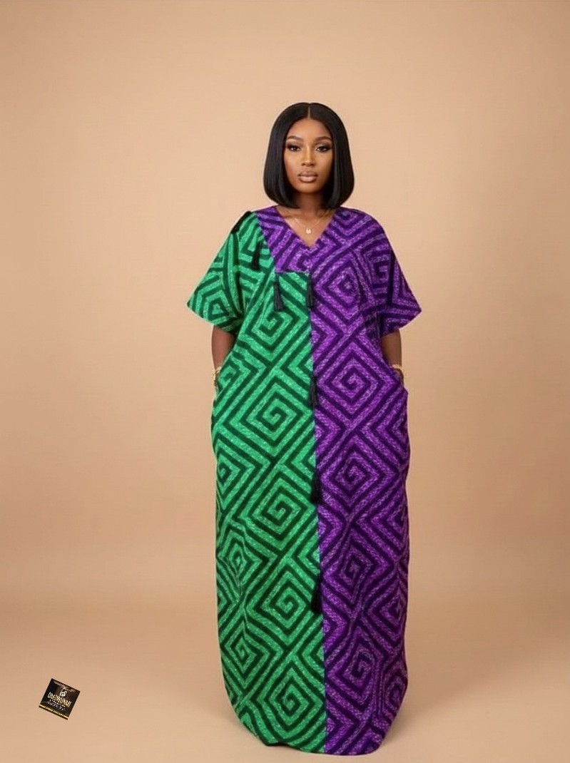 This striking floor-length kaftan features a captivating split-panel design, combining rich emerald green and deep violet hues adorned with a mesmerizing geometric diamond pattern. Expertly crafted from a high-quality, breathable cotton-blend fabric that offers both structure and a soft, comfortable drape, the garment is elevated by elegant black tassel accents along the center seam for a touch of bohemian flair. Designed with a classic V-neckline, relaxed short sleeves, and practical side pockets. It serves as an ideal choice for a variety of occasions, from sophisticated lounge hosting and upscale beach resort dinners to cultural celebrations and festive garden parties where effortless elegance is key.