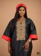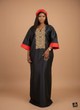 This elegant floor-length black kaftan, designed for sophisticated occasions, features a relaxed, free-flowing silhouette with wide, elbow-length kimono sleeves. The sleeves are beautifully accented with a vibrant red trim, providing a striking contrast to the deep black fabric. A key focal point of the dress is the plunging V-neckline, which is ornately detailed with intricate gold embroidery in a rich, geometric pattern, offering a luxurious and traditional aesthetic. The simplicity of the satin-like fabric allows the embroidery and the bold red accents to stand out, creating a refined piece that balances comfort with opulent style, perfect for formal events or cultural celebrations.