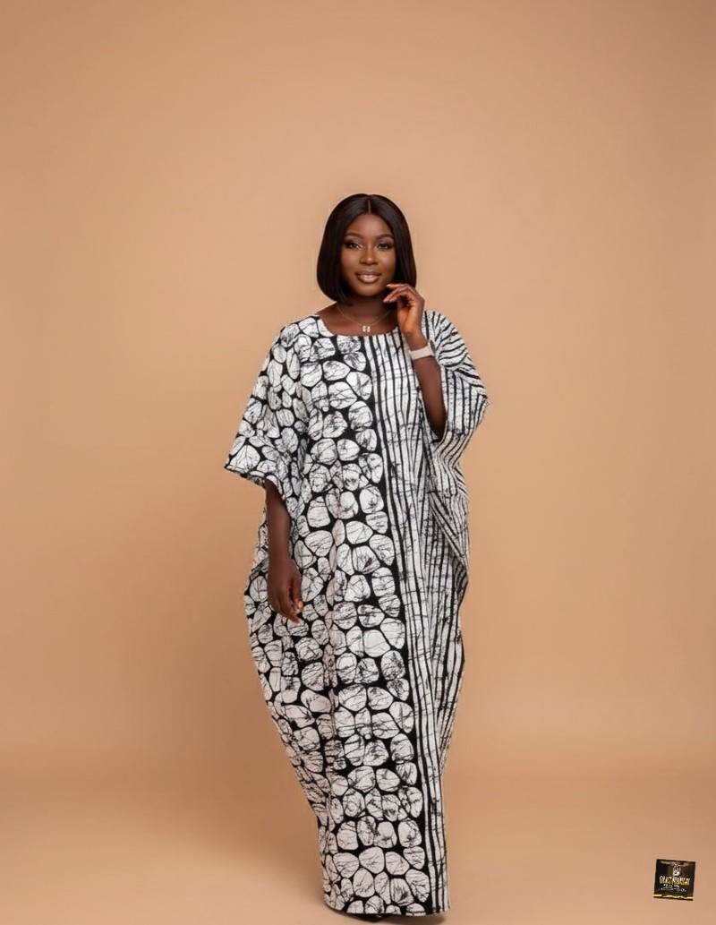 This striking floor-length kaftan features a captivating monochromatic design, masterfully combining an intricate black-and-white pebble or stone batik pattern on one side with sharp, vertical stripes on the other. Meticulously crafted from premium, high-quality batik, the fabric offers a crisp yet breathable feel and a structured drape that ensures a regal and effortless silhouette. The gown is designed with a classic rounded neckline and voluminous, relaxed sleeves, providing a sophisticated canvas for the bold, graphic contrast of the artisanal prints. Perfectly paired with a timeless gold chain wristwatch, this majestic piece is an ideal choice for high-profile cultural gatherings, upscale art gallery openings, or as a distinguished ensemble for a formal garden party where you want to radiate modern elegance and cultural pride.
